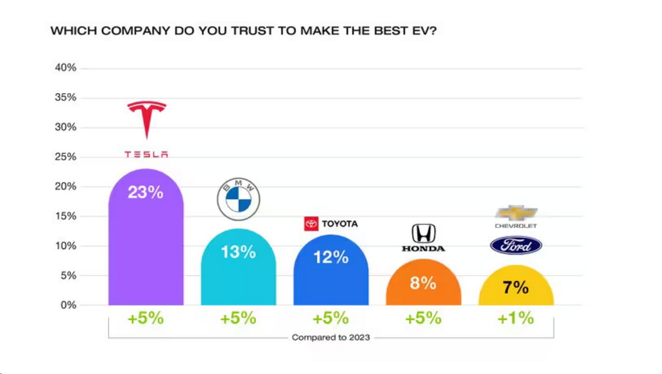 The disconnect between consumer preferences and available options goes deeper, too. Although consumers express the most trust in Tesla for producing EVs, Toyota and Honda also rank highly (third and fourth, respectively, with BMW in second place), despite their limited EV offerings. Conversely, Kia and Hyundai were ranked poorly, despite the fact that they offer a variety of smaller EVs with solid performance.