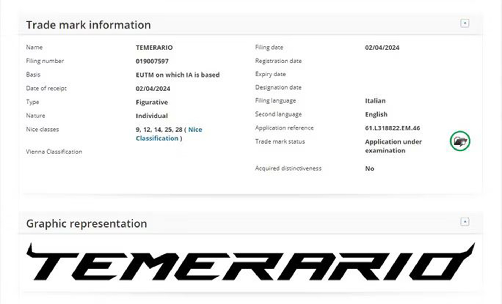 It recently emerged that the Italian supercar manufacturer had submitted a trademark filing with the European Intellectual Property Office (EUIPO) for the name ‘Temerario’. As noted by Carbuzz that discovered it, this trademark filing also includes a graphic representation of the name, showing Temerario in a familiar Lamborghini text with bull horns on the corners of the ‘T’ and the ‘O.’