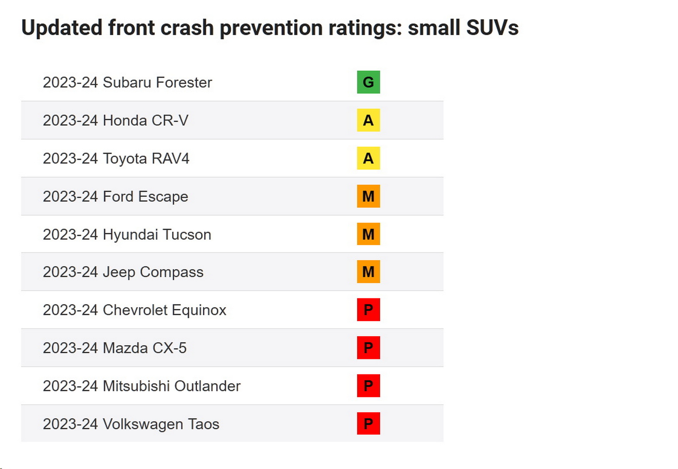 The Honda CR-V and Toyota RAV4 earned “acceptable” ratings, while the Ford Escape, Hyundai Tucson, and Jeep Compass received a “marginal” rating. These vehicles fell short because of inconsistent performance in the higher speed tests, and collision warnings that came too late.