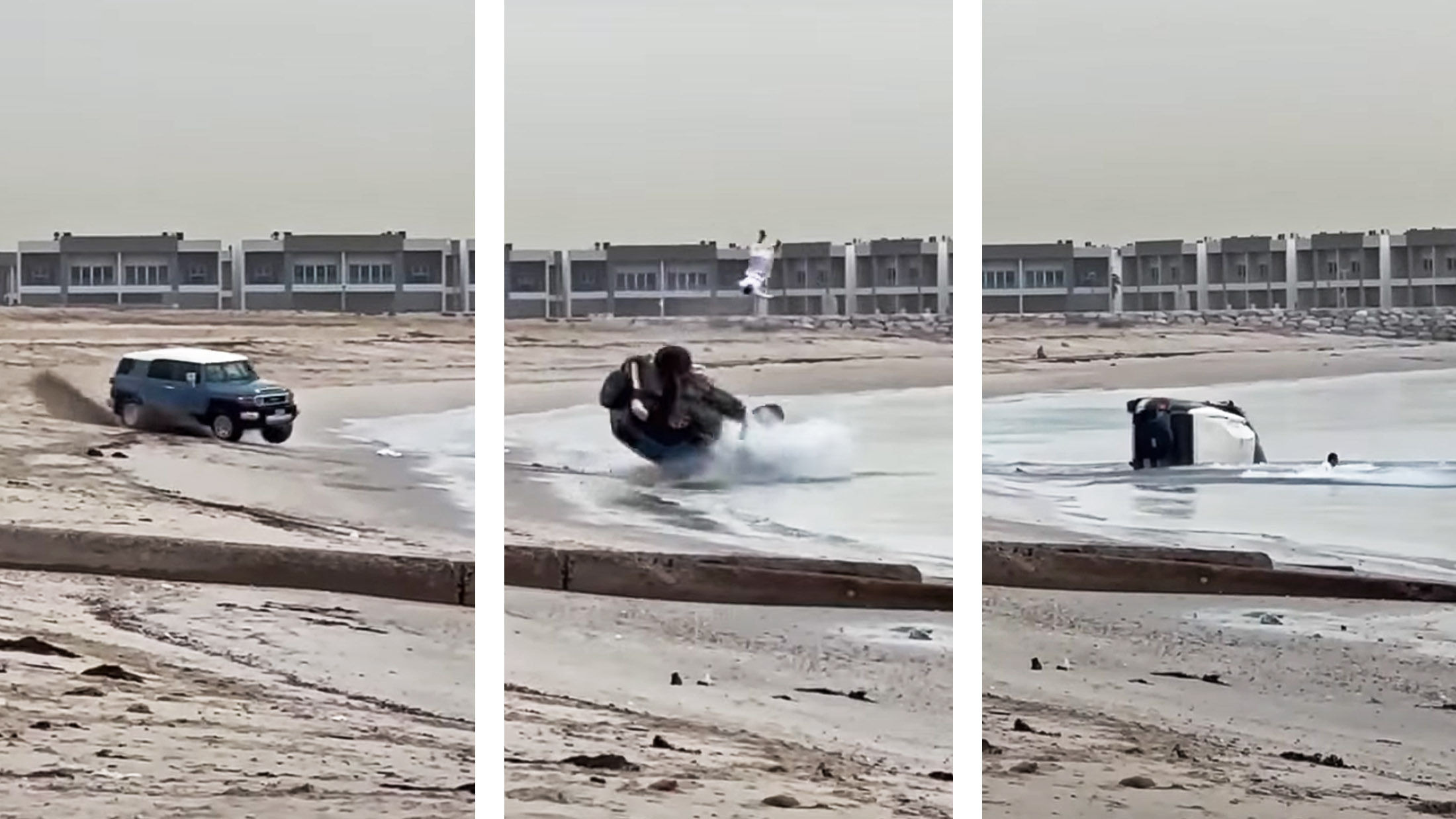 A 34-year-old man in Kuwait had a near-death experience in an unbelievable accident when his reckless driving sent him on a brief flight 16 feet above the shallow waters of a sandy beach. The terrifying incident, involving a Toyota FJ Cruiser, was caught on camera, proving that the driver is lucky to be alive.