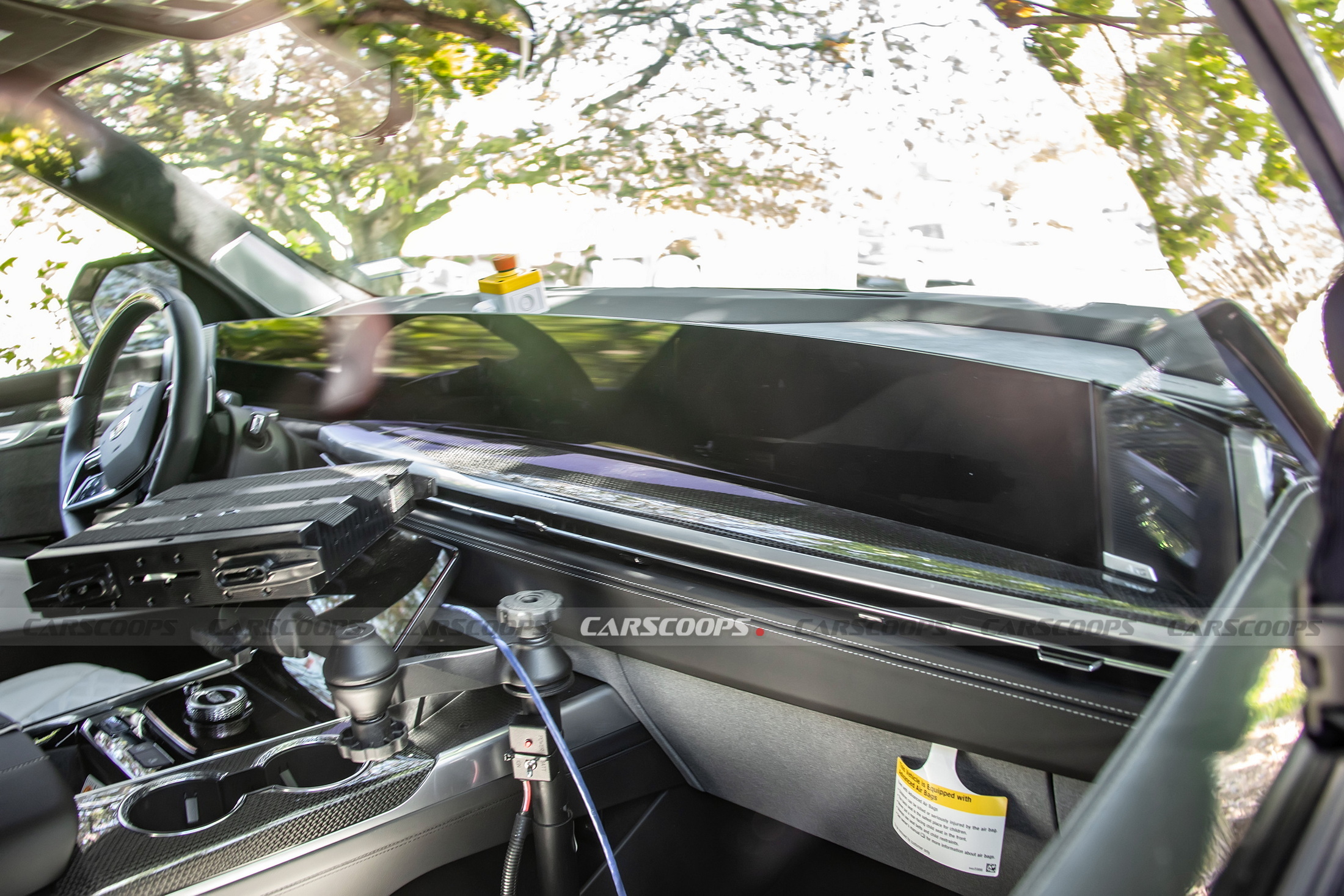 The overhauled interior appears to be shared with the fully electric Escalade IQ, incorporating the massive 55-inch display covering the entire width of the dashboard. We can also see the new two-spoke steering wheel and the inclined 11-inch touchscreen on the center console. The prototype has other kinds of equipment lying around the interior, showing that it is still undergoing testing.