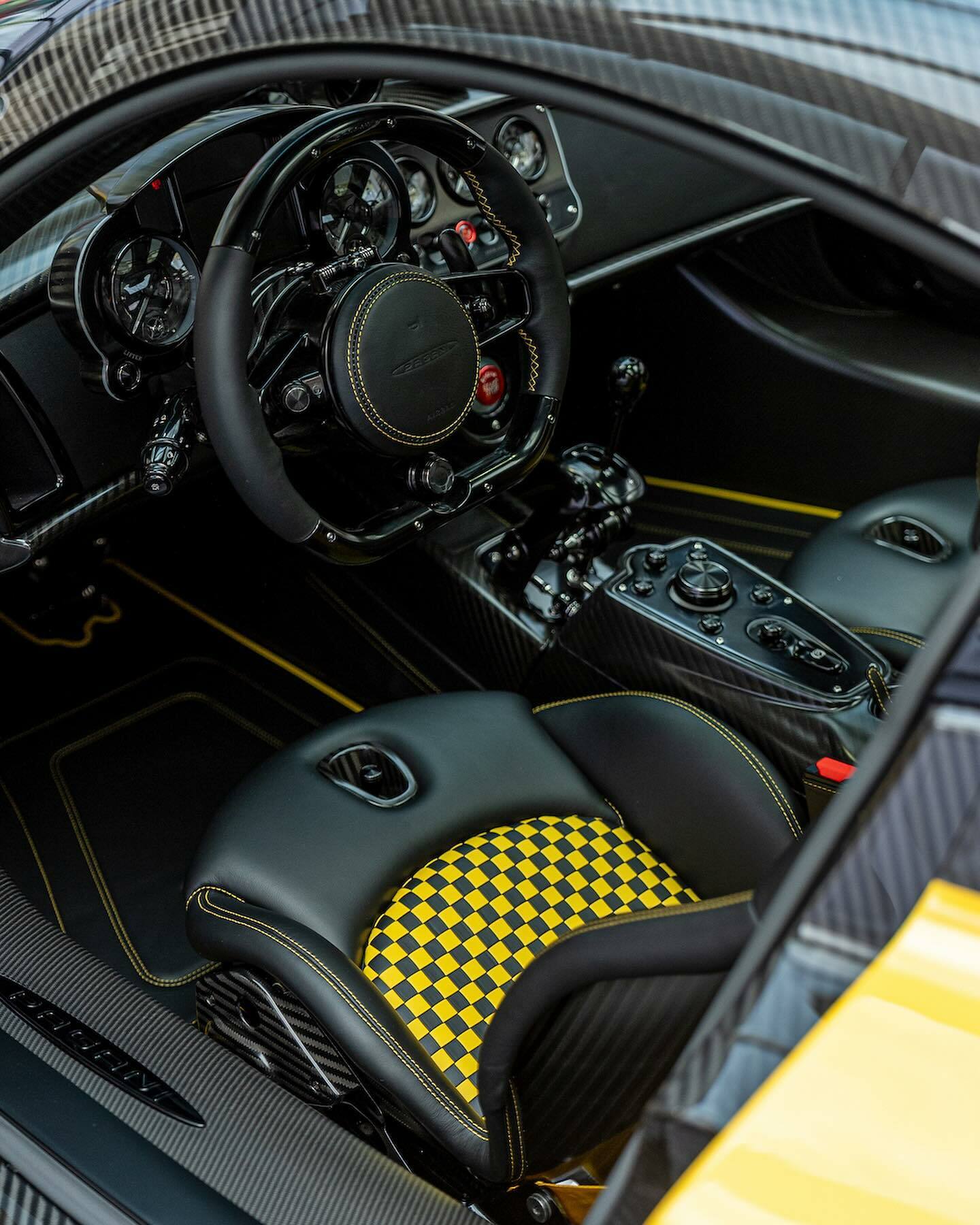 Then there’s the cabin. The Utopia’s seats are primarily finished in black leather with yellow stitching but the centers have a chequered flag pattern of yellow and black leather. Pagani has also fitted yellow seat belts and bathed the gauge cluster and transmission tunnel in carbon fiber, rather than the aluminum finish that’s also available.