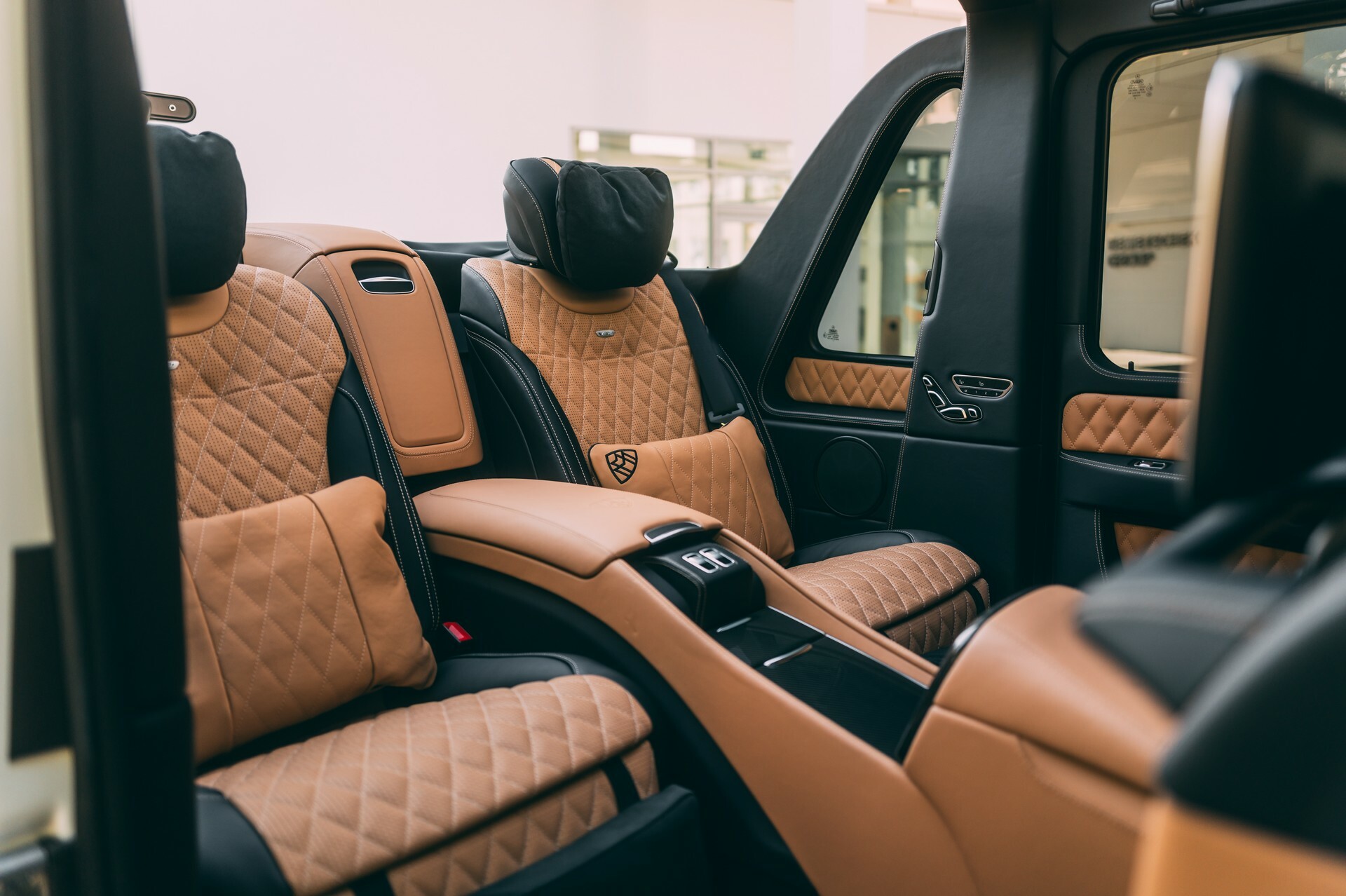 The interior is a wonderful place to be. Beige and black Nappa leather is abundant and passengers in the rear get a pair of reclining seats, matching cushions, and can enjoy the sun on their faces thanks to the 4×4’s retractable soft top. A thumping Harman Kardon sound system is also installed, as are velour floor mats and various AMG carbon fiber details.
