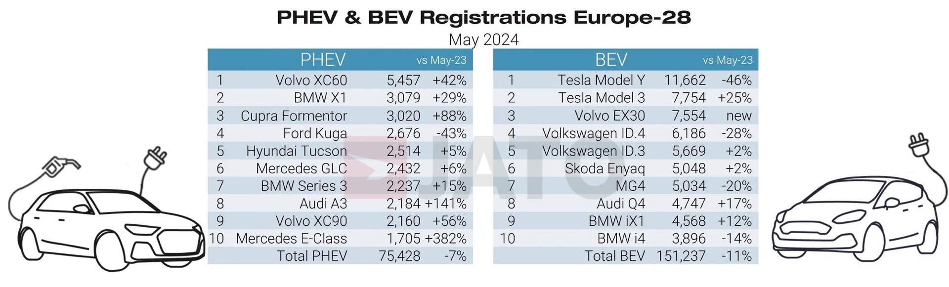 Overall, European new car registrations dropped by 2.5 percent in May 2024 versus the year before but remain higher than they were following years riddled by post-pandemic production turmoil in 2021 and 2022. A total of 1.09 million units were registered last month.