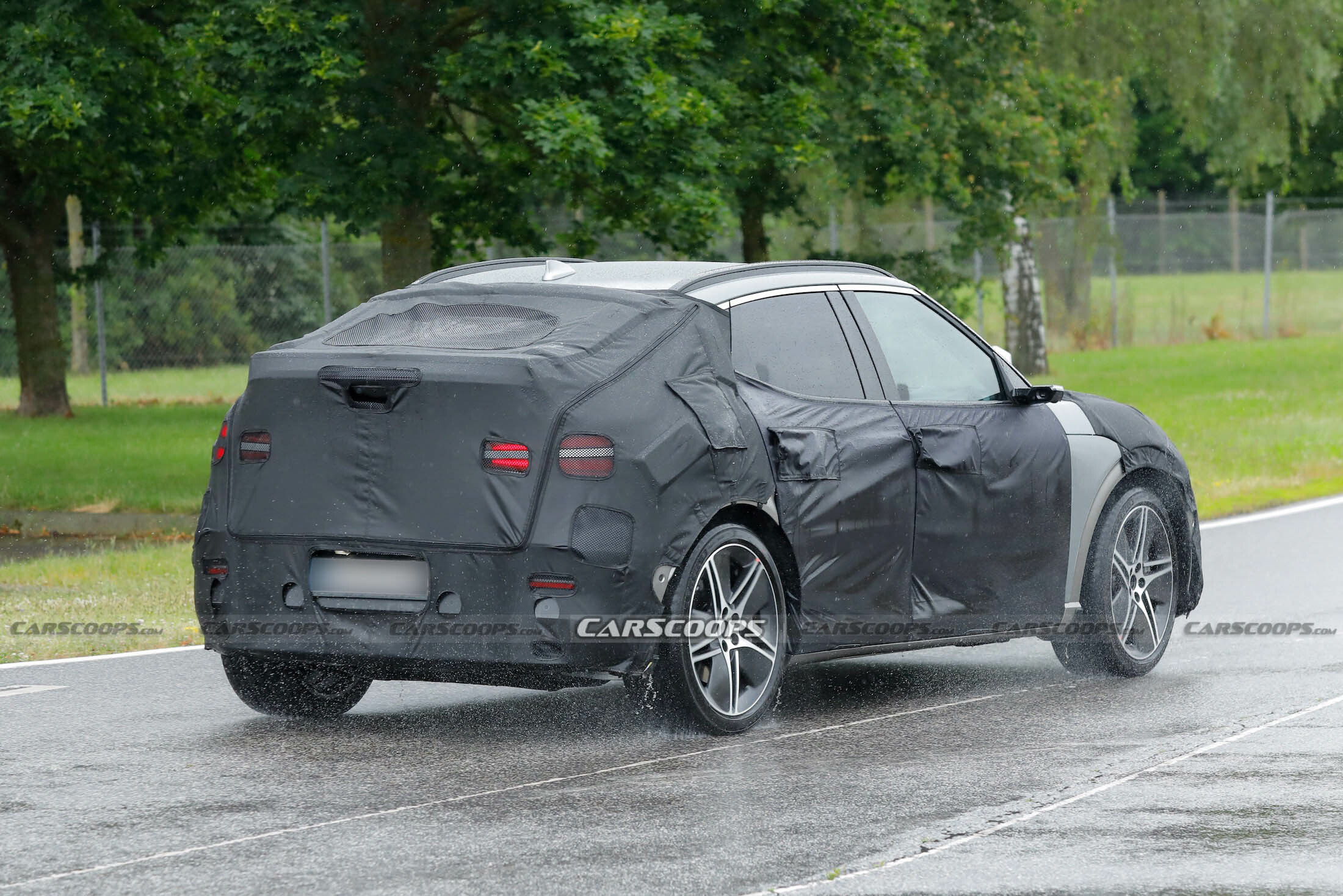 The new front bumper’s boxier shape and more vertical side air intake visible through the disguise perfectly matches the look of a facelifted GV60 glimpsed in a promo video Genesis released earlier in the year – and then quickly deleted. And though this prototype’s headlights are similar to the current crossover’s, each lamp unit is now made up of two rows of seven LED cubes, instead of two rows of five.