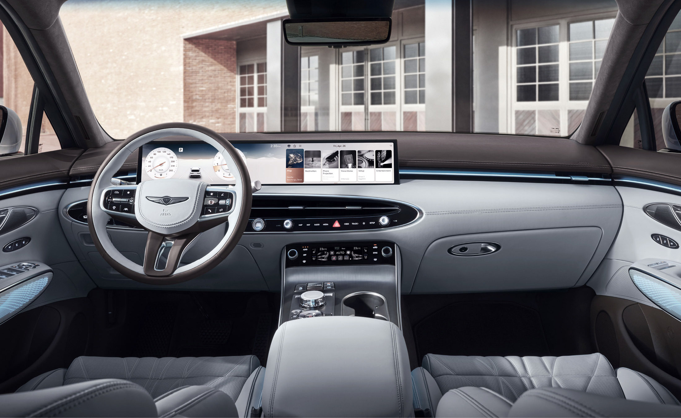 The biggest changes coming to the Electrified take place inside the cabin, where, judging by what we’ve seen on the ICE model, Genesis has fitted a 27-inch combined gauge cluster and infotainment screen that stretches almost two-thirds of the way across the car.