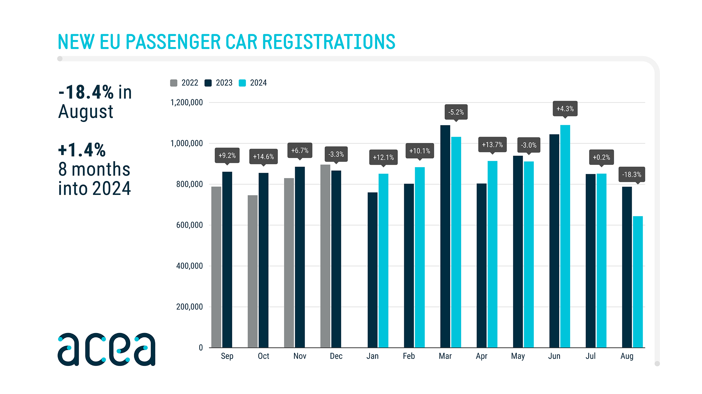 In August 2024, new car registrations totaled 643,637, marking an 18.3 percent drop compared to August 2023. This sharp decline represents the lowest sales figures in three years.