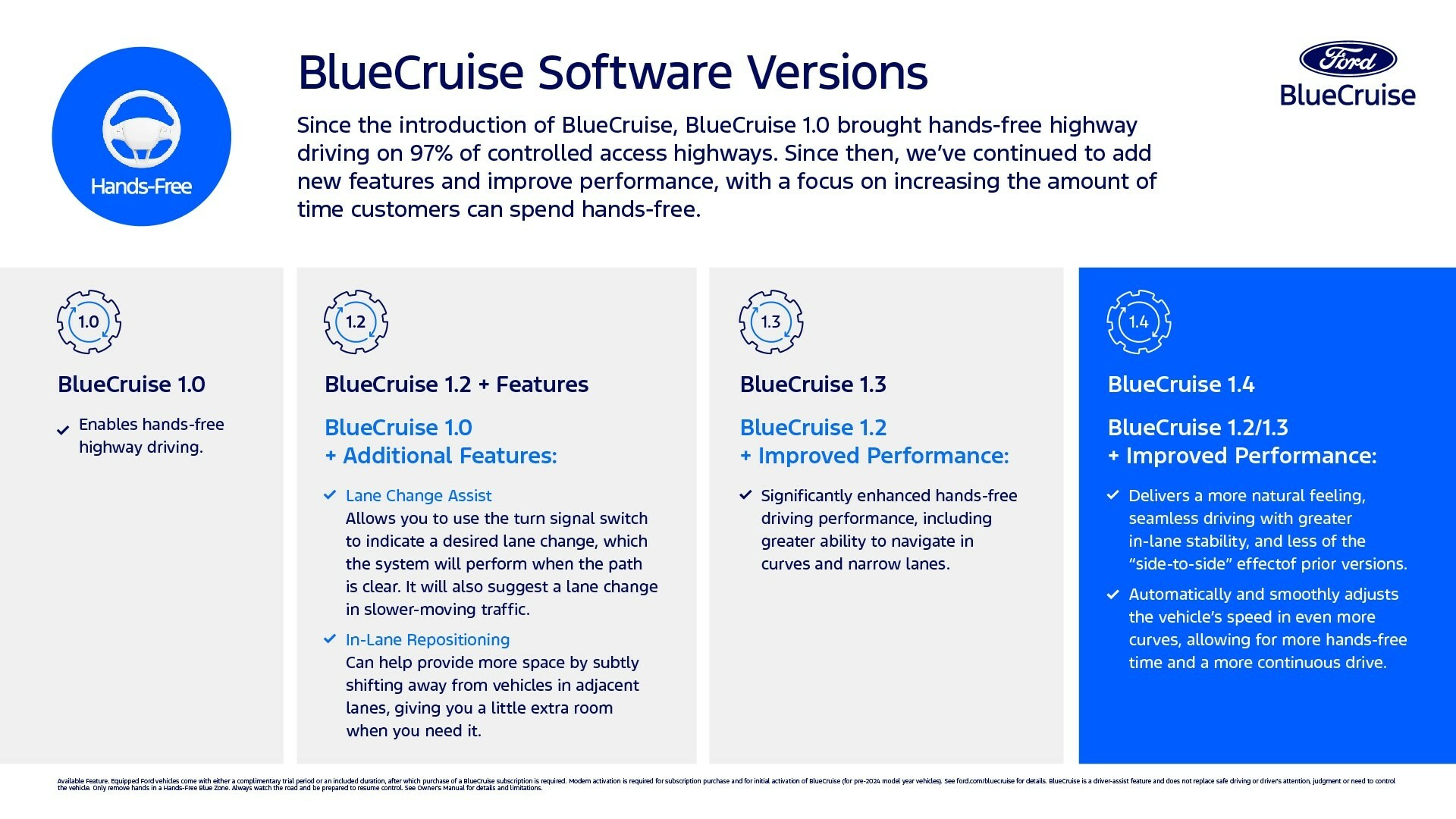 - Ford has introduced BlueCruise 1.4, which promises to remain in hands-free mode for longer without interruption.