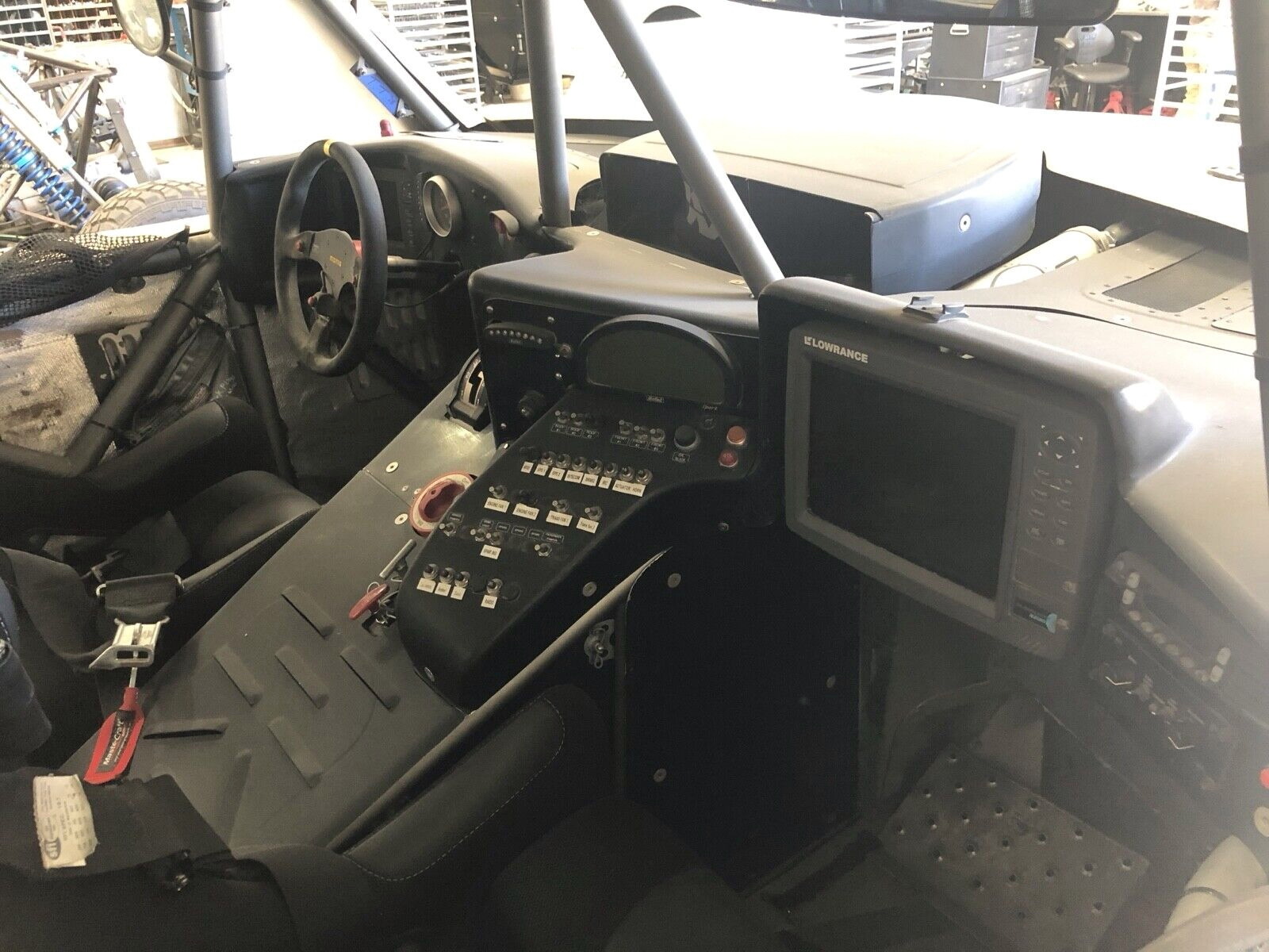 As is typical of trophy trucks like this, it’s equipped with body panels that can be easily removed and replaced. In fact, it is being sold with two different bodies, one with Ashcraft Racing branding and the other used by Honda Racing. Beefy Fox shocks are found at all four corners, and the truck sits on a set of massive 39-inch off-road tires. The rear is even large enough to support two full-sized spares and a large trolley jack.