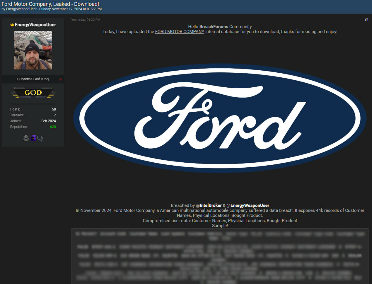 The alleged leak reportedly included names, locations, and details about the Ford products these customers purchased.