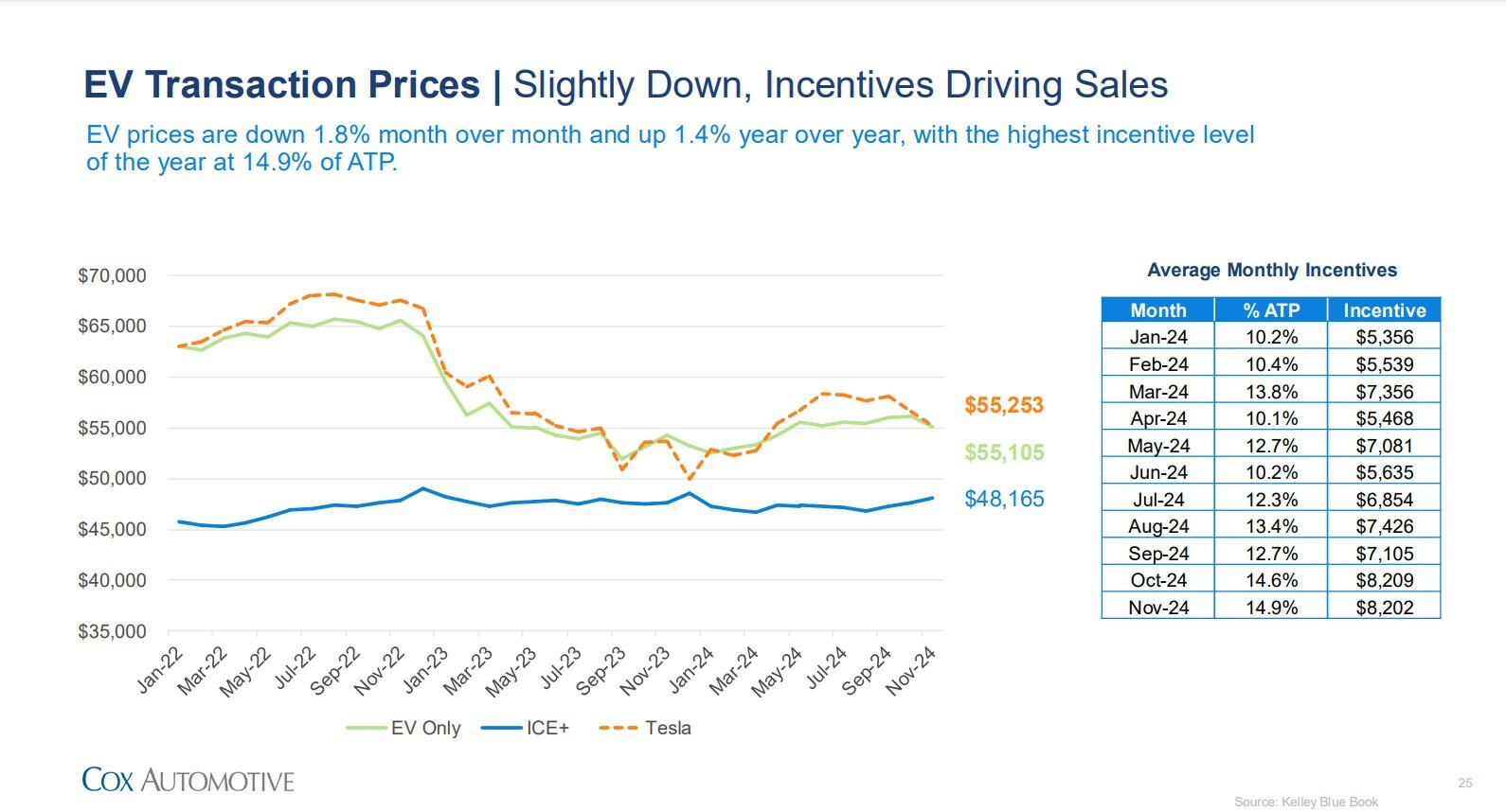 EV transaction prices have fallen significantly and this has been aided by hefty incentives, which were introduced to help reduce excess inventory over the summer. While supply levels are now similar to traditional vehicles, EVs had an average of $8,202 in incentives last month. Transaction prices also fell to $55,105, which is down from around $63,000 at the start of 2022.