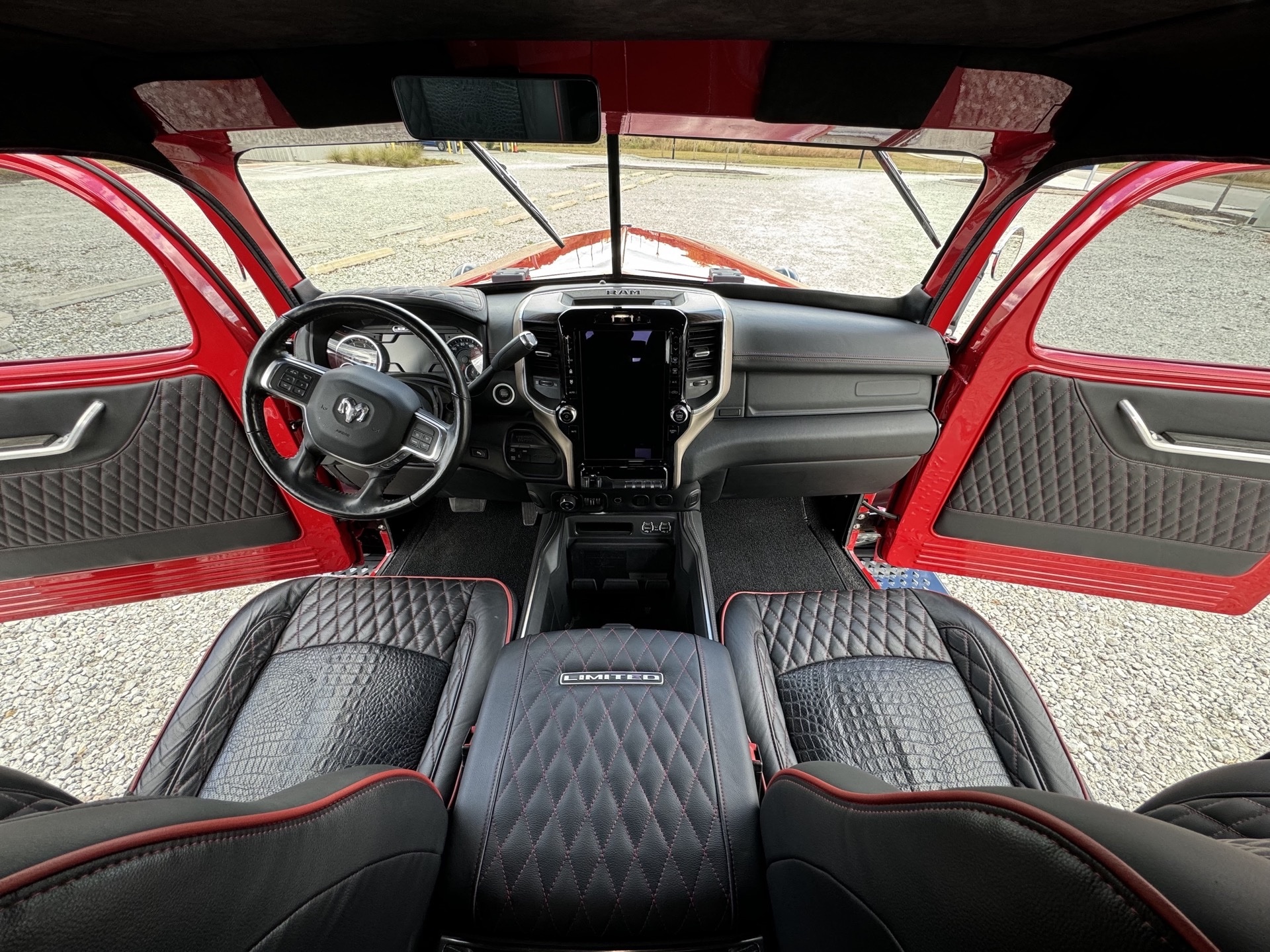 The interior has been modernized with design elements “inspired” by the present-day Ram 2500 Limited. It features custom upholstery, including diamond-stitched Ebony Salerno leather with red piping and crocodile-embossed accents. The cabin also includes heated and ventilated seats, a Shizhen 12-inch touchscreen, dual-zone climate control, and a JL Audio sound system.