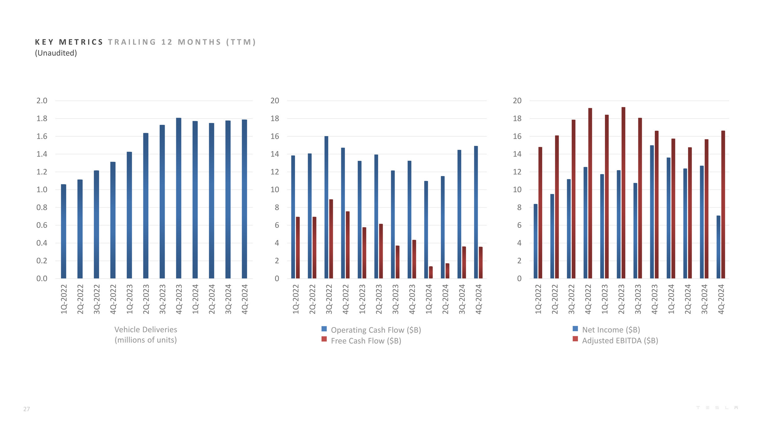 Overall, Tesla’s profits took a hit in 2024, with net income dropping to $8.4 billion, marking a 23% drop from 2023 and an even steeper 40% decline from its record $14.1 billion profit in 2022. Still, total revenue for 2024 managed a slight uptick, reaching $97.7 billion, a modest 1% increase over the previous year’s record.