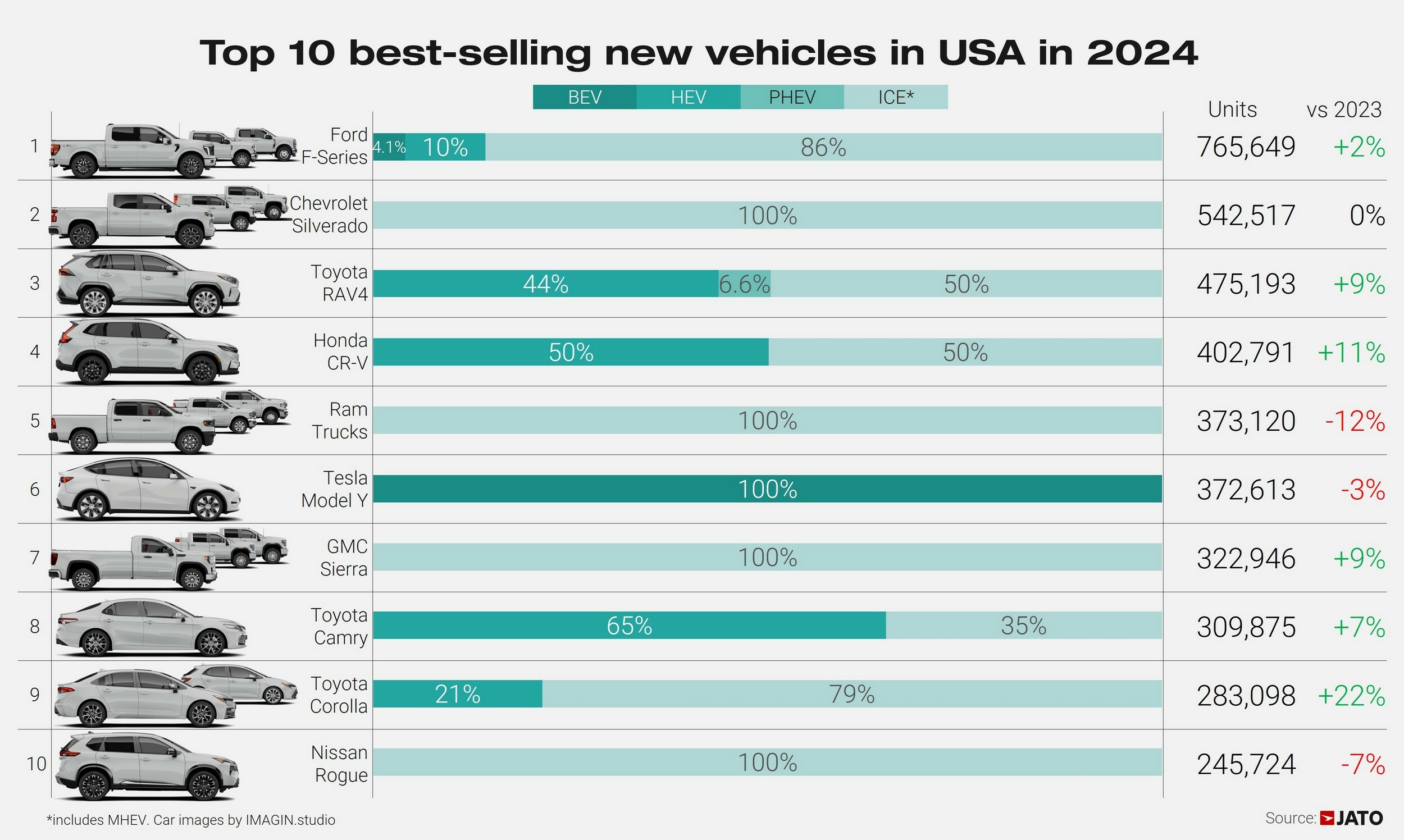 Of course, one of the biggest stories of the year was the downfall of the Ford F-150. Despite a facelift, sales dropped 5% to 460,915 units. This enabled the Toyota RAV4 to become the best-selling vehicle in America with sales of 475,193 units.