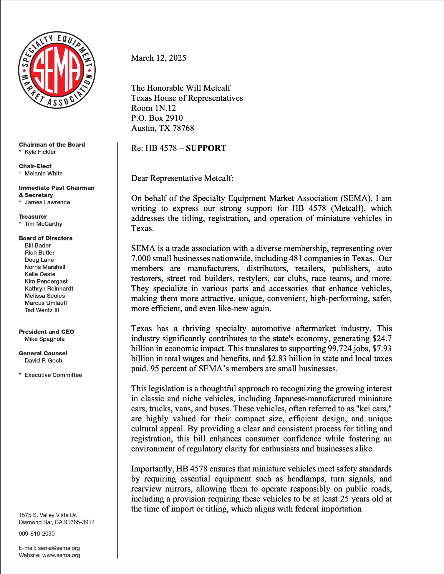 - SEMA supports the bill introduced by State Senator Kelly Hancock for Kei car legalization.