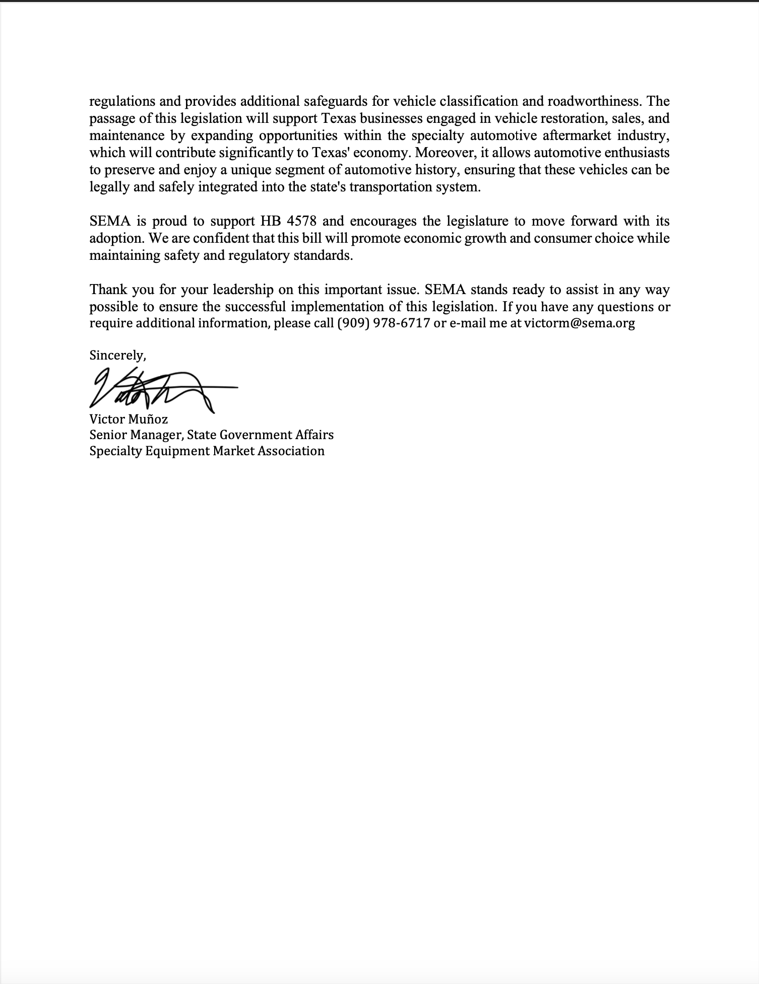 The senior manager of State Government Affairs at SEMA, Victor Munoz, through the association’s support behind the efforts in a letter addressed to Will Metcalf in the Texas House of Representatives.