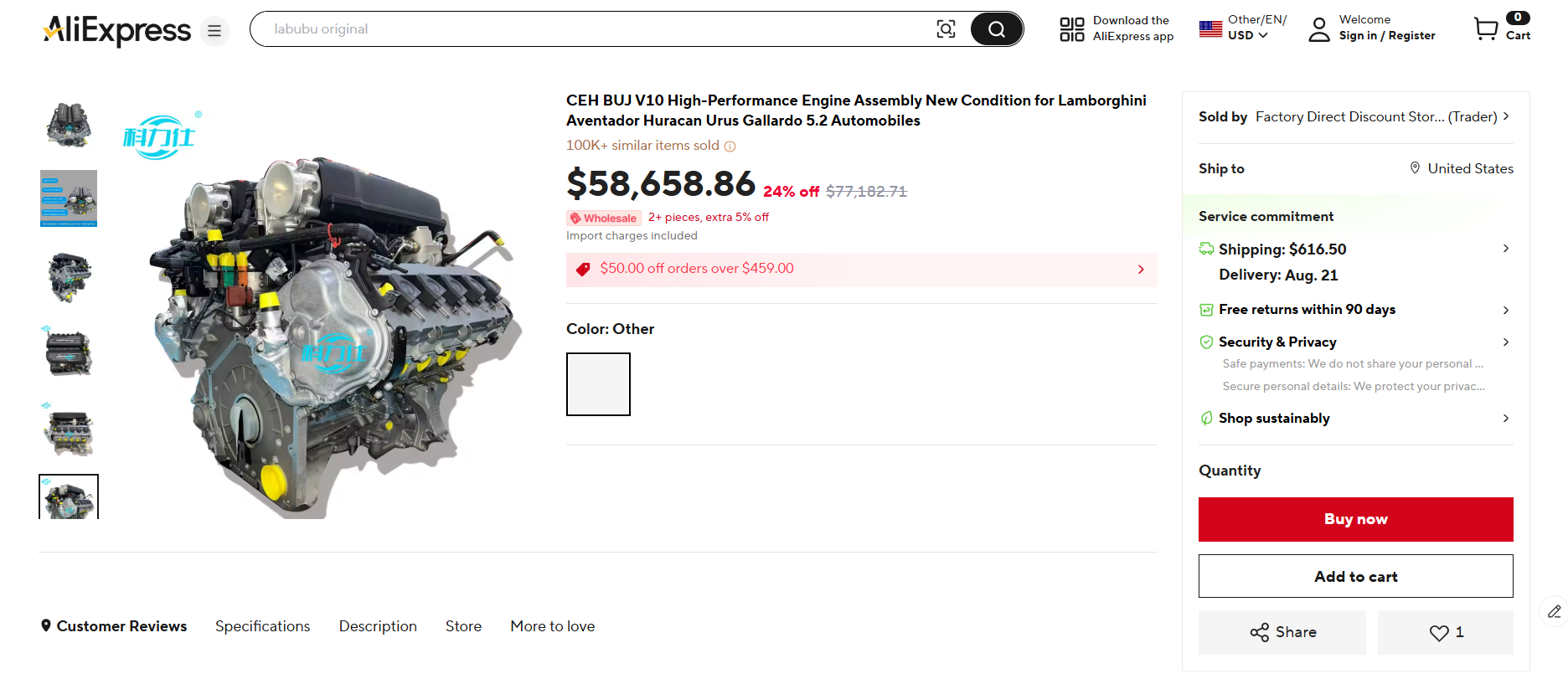Listed on Aliexpress for a cool $58,658.86, this is a naturally aspirated V10 from a 2009-2014 Gallardo. The listing even mentions the LP560-4, which indicates this engine should make around 552 horsepower (412 kW) and 398 lb-ft (540 Nm) of torque. That’s nothing to turn one’s nose up at but the rest of this listing sure is. First, the main descriptive line says “for Lamborghini Aventador Huracan Urus Gallardo”.