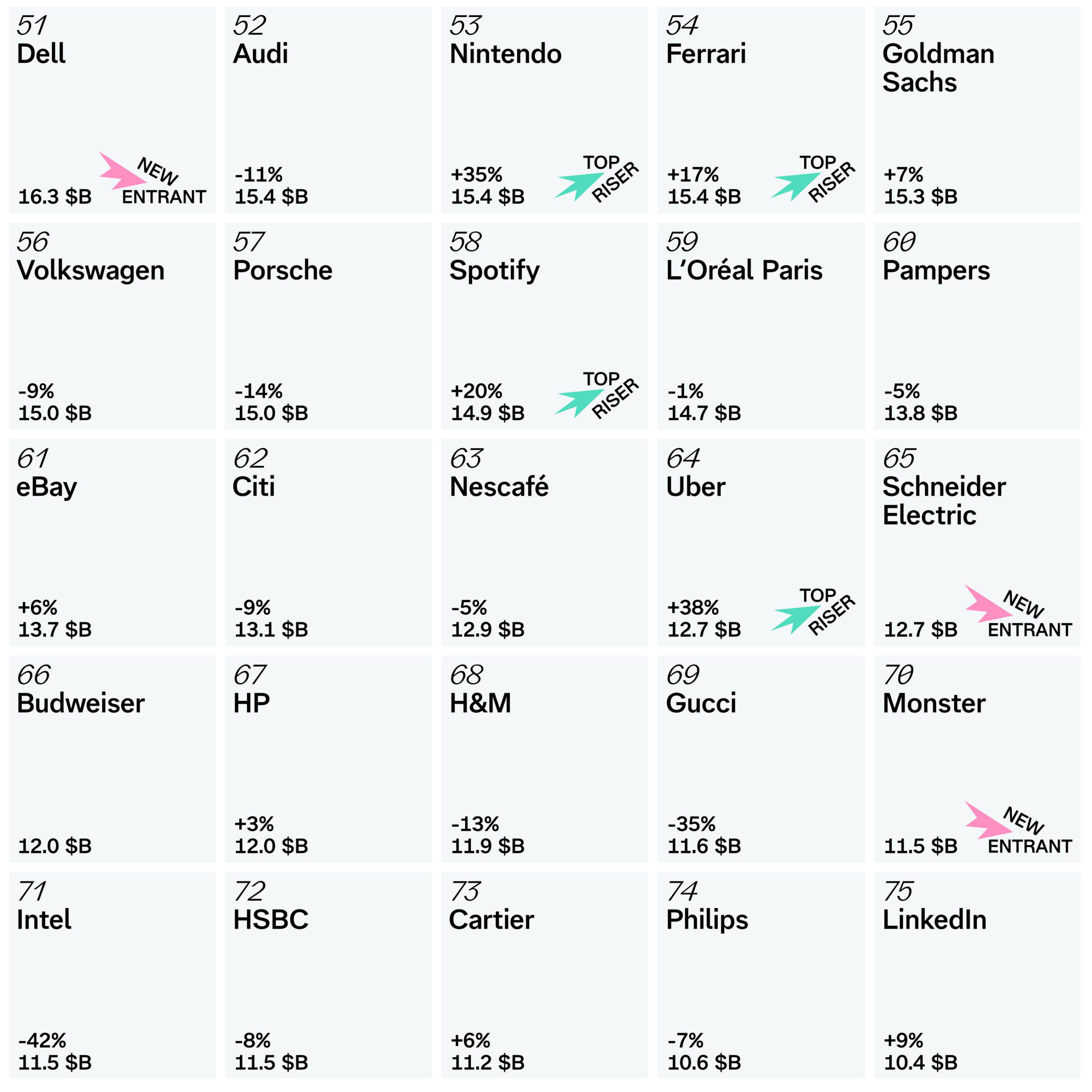 Continuing down the list was Honda (#29), Hyundai (#30), Sony (#34), Audi (#52), and Ferrari (#54). They were followed by Volkswagen (#56), Porsche (#57), Uber (#64), Xiaomi (#81), and Nissan (#82). Rounding out the highlights are Kia (#89), Huawei (#96), and Range Rover (#97).