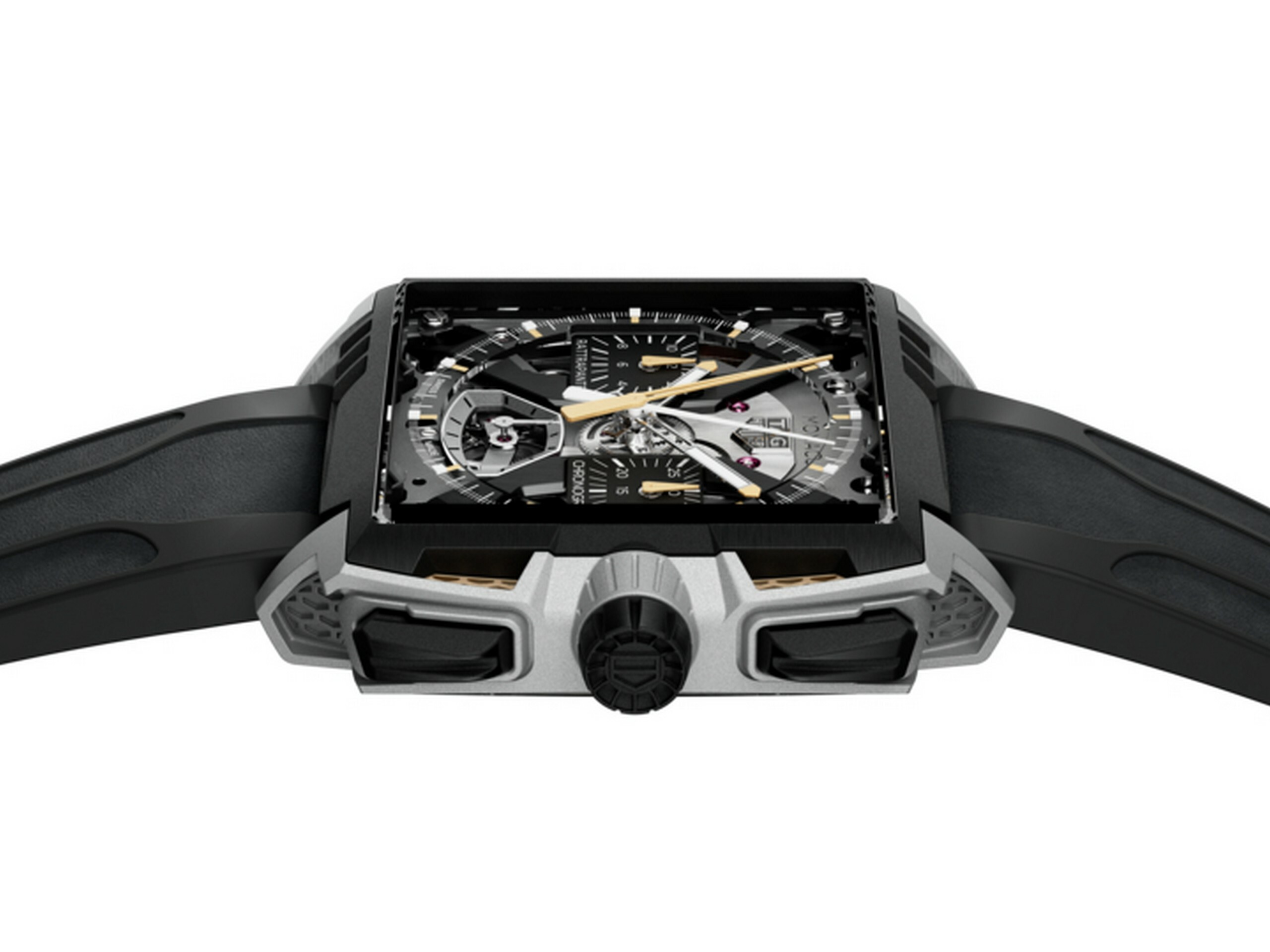 The square dial, a defining hallmark of the Monaco range, is still present here, though interpreted through a distinctly futuristic lens.