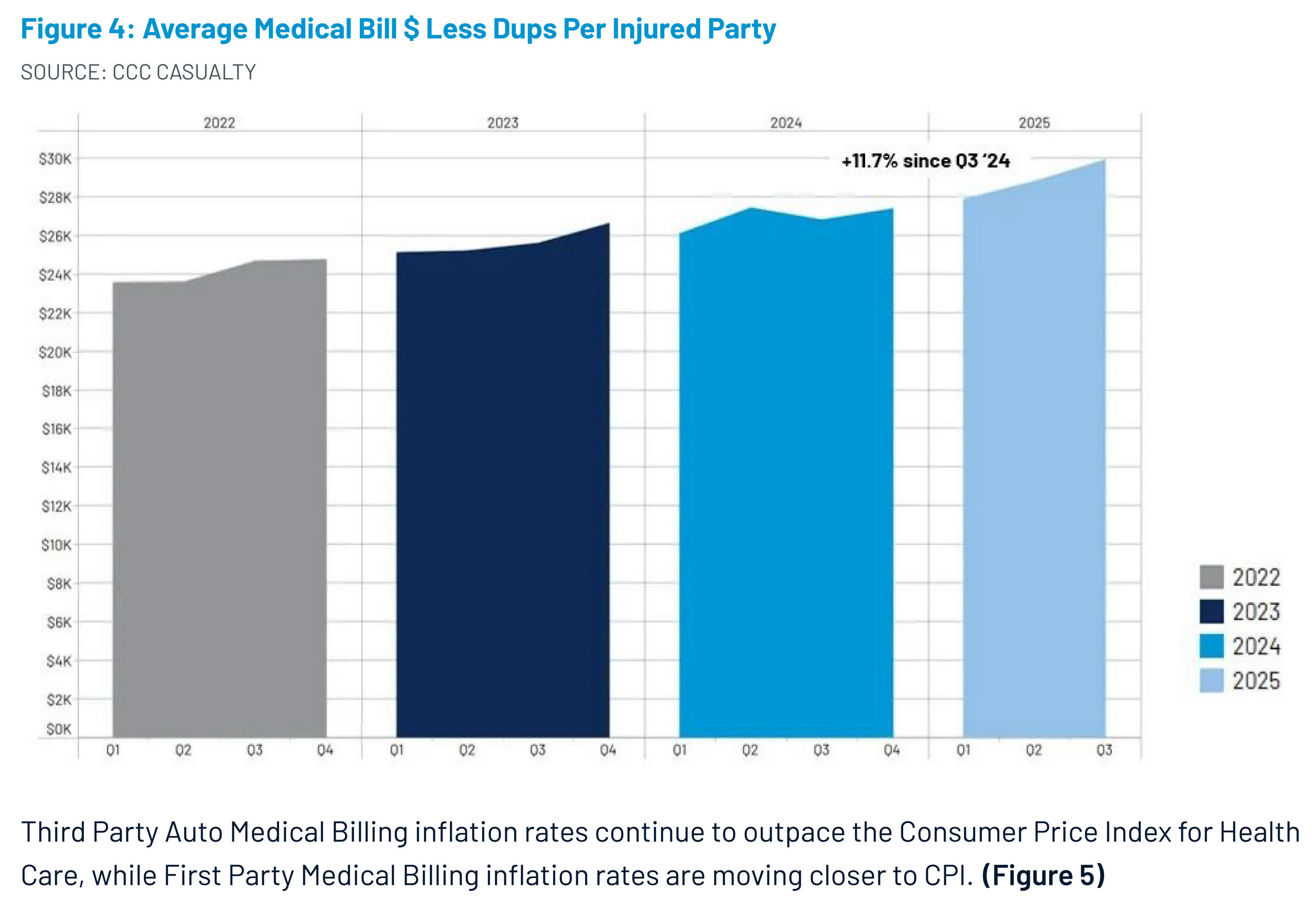 Even cars that don’t end up as total losses add to the increase in insurance premiums since repairs often cost more than they used to. Through Q3 2025, the average total cost of repair rose from $4,700 to $4,768. Medical claim costs are rising too, with more frequent injury-related payouts and higher-cost treatments showing up earlier in the claims process.