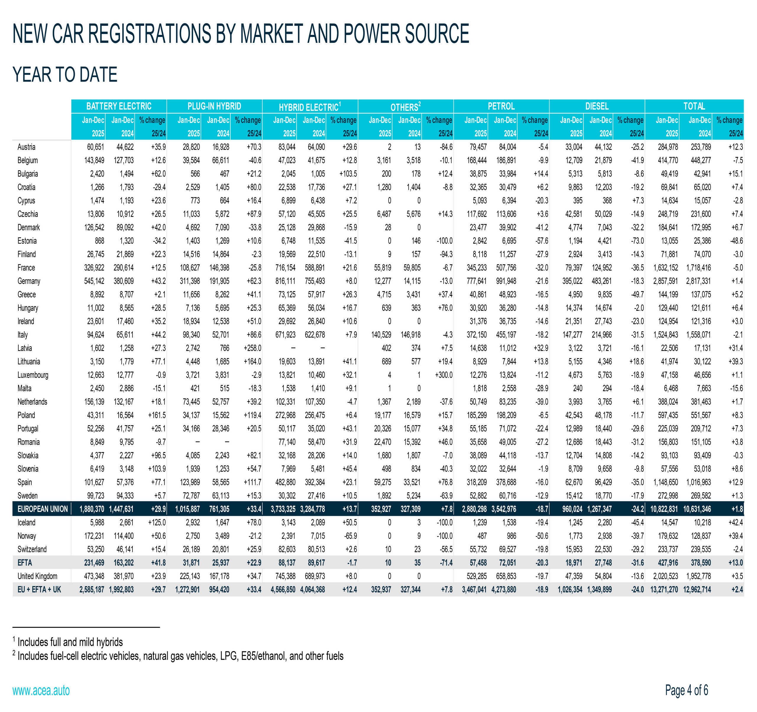 Across the European Union, the UK, and members of the European Free Trade Association, including Iceland, Norway, and Switzerland, a total of 13,271,270 new vehicles were sold throughout 2025. That marks a modest but notable 2.4 percent uptick from the previous year. Within that total, BEVs accounted for 2,585,187 sales, a significant 29.7 percent increase over the 1.9 million sold in 2024.