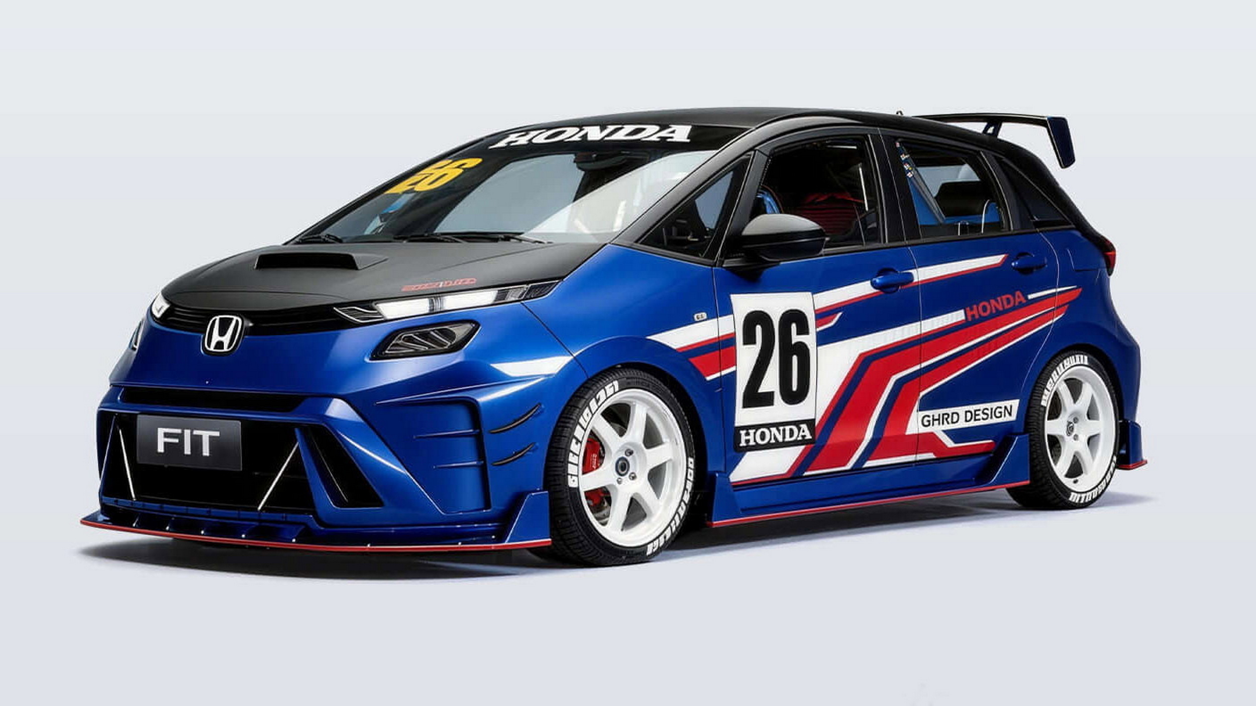 Tucked into one of Honda’s official press images showing all four generations of the Fit, there’s a surprise: a heavily modified concept version of the hatchback. This one features a more aggressive body kit, pronounced aero parts, a lowered stance, bold wheels, and a racing-inspired livery.