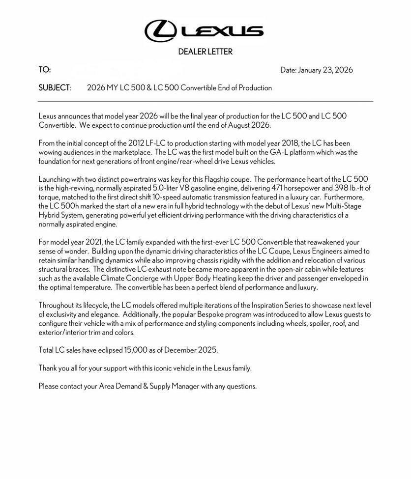Lexus has quietly confirmed what many enthusiasts have long suspected: the LC 500 is heading toward retirement. According to an official dealer letter dated January 23, 2026, the 2026 model year will be the final one for both the LC 500 coupe and LC 500 Convertible in the States, with production expected to wrap up at the end of August.
