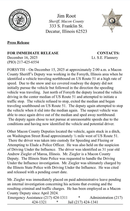 According to the Macon County Sheriff, officers had identified Ziegler by that point but terminated a chase. It was only when another officer found Ziegler in a ditch that they managed to take him into custody.