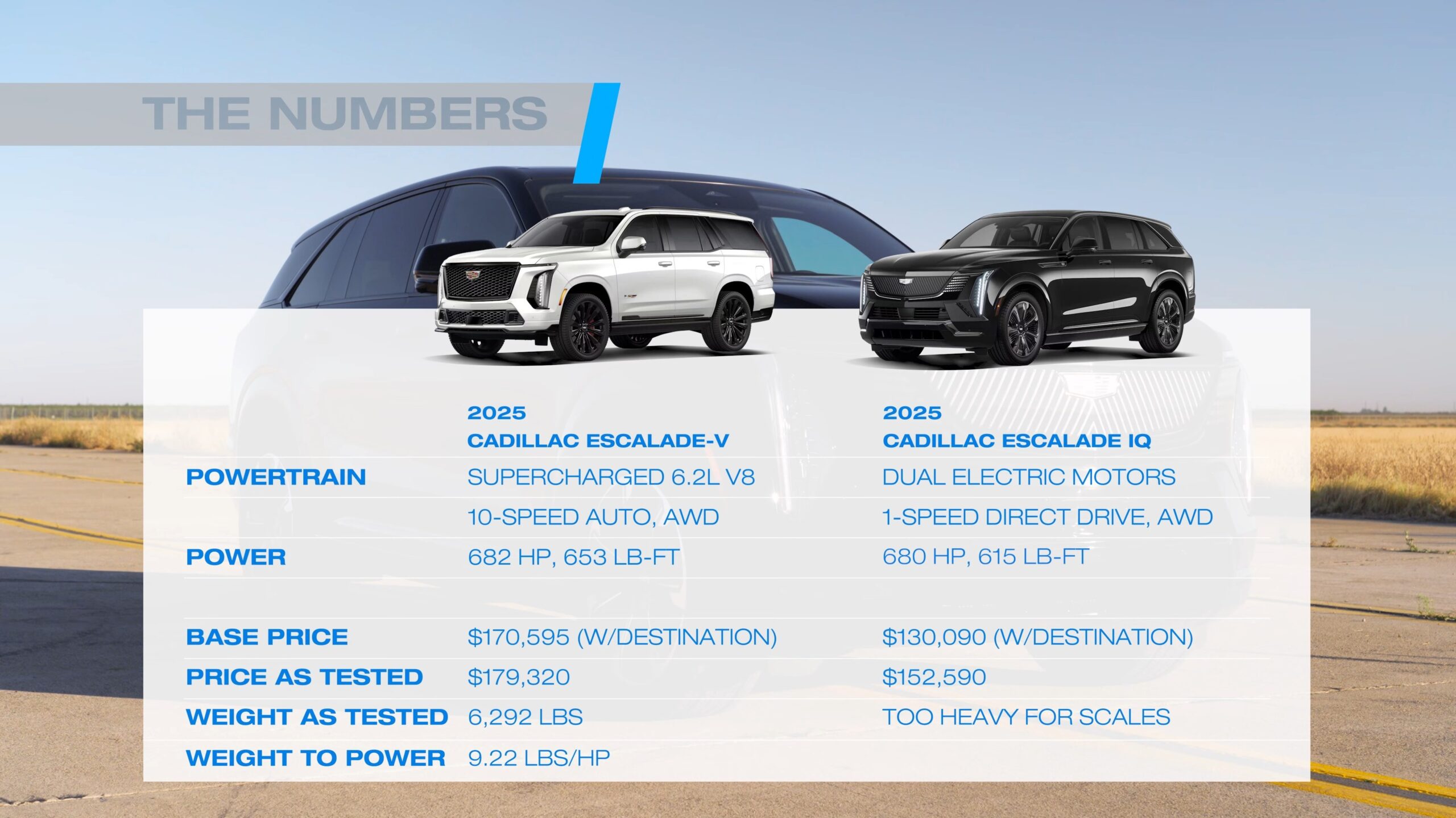 During the first test, the V8-powered version got the jump off the line. After the U-turn, however, the transmission struggled to find the right gear, and the hesitation cost the Escalade-V its lead. That opened the door for the electric IQ to surge past and cross the line several lengths ahead.