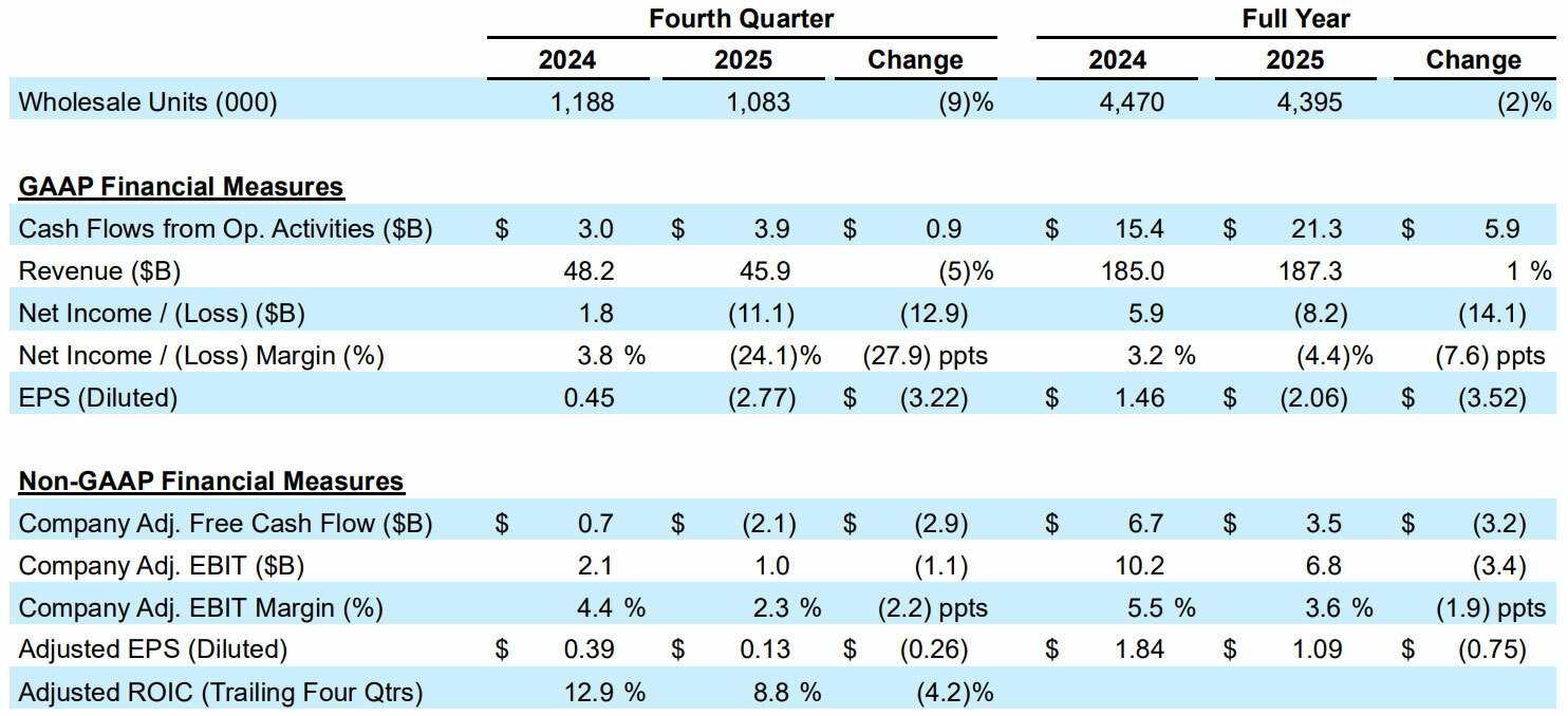 CEO Jim Farley said, “Ford delivered a strong 2025 in a dynamic and often volatile environment. We improved our core business and execution, made significant progress in the areas of the business we control – lowering material and warranty costs and making real progress on quality – and made difficult but critical strategic decisions that set us up for a stronger future.”