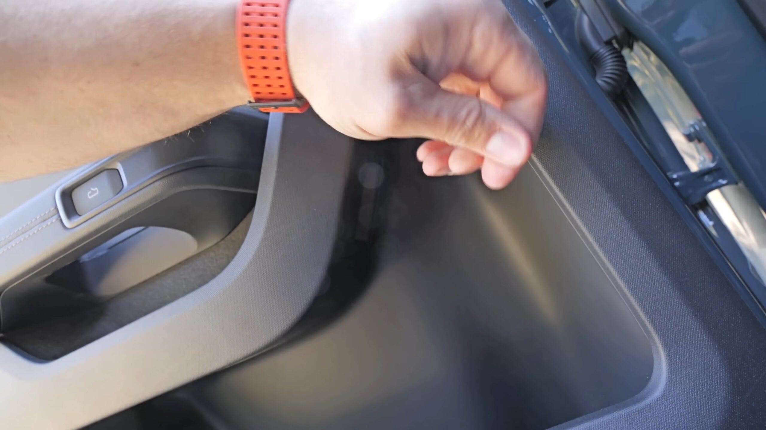 The latch in the front row is quite simple. Positioned on the underside of the floating storage compartment is a little black plastic handle used to open the doors in emergencies. It’s similar to what’s found in the R1T and R1S, although the emergency releases on those models are larger and easier to identify.