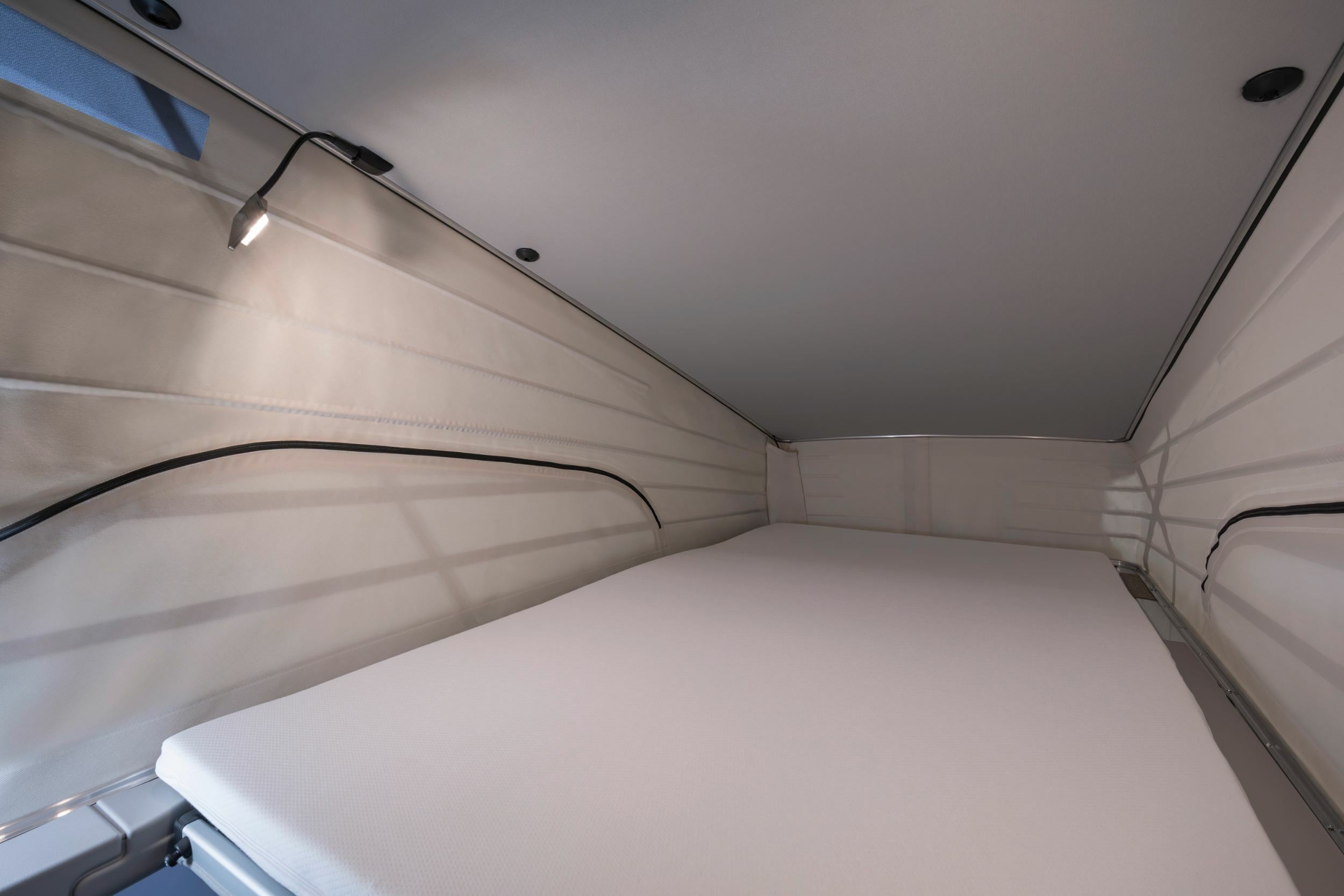 In addition to the bed in the pop-up roof, the rear seat bench can be reconfigured and folded down to form a second double bed inside the main cabin.