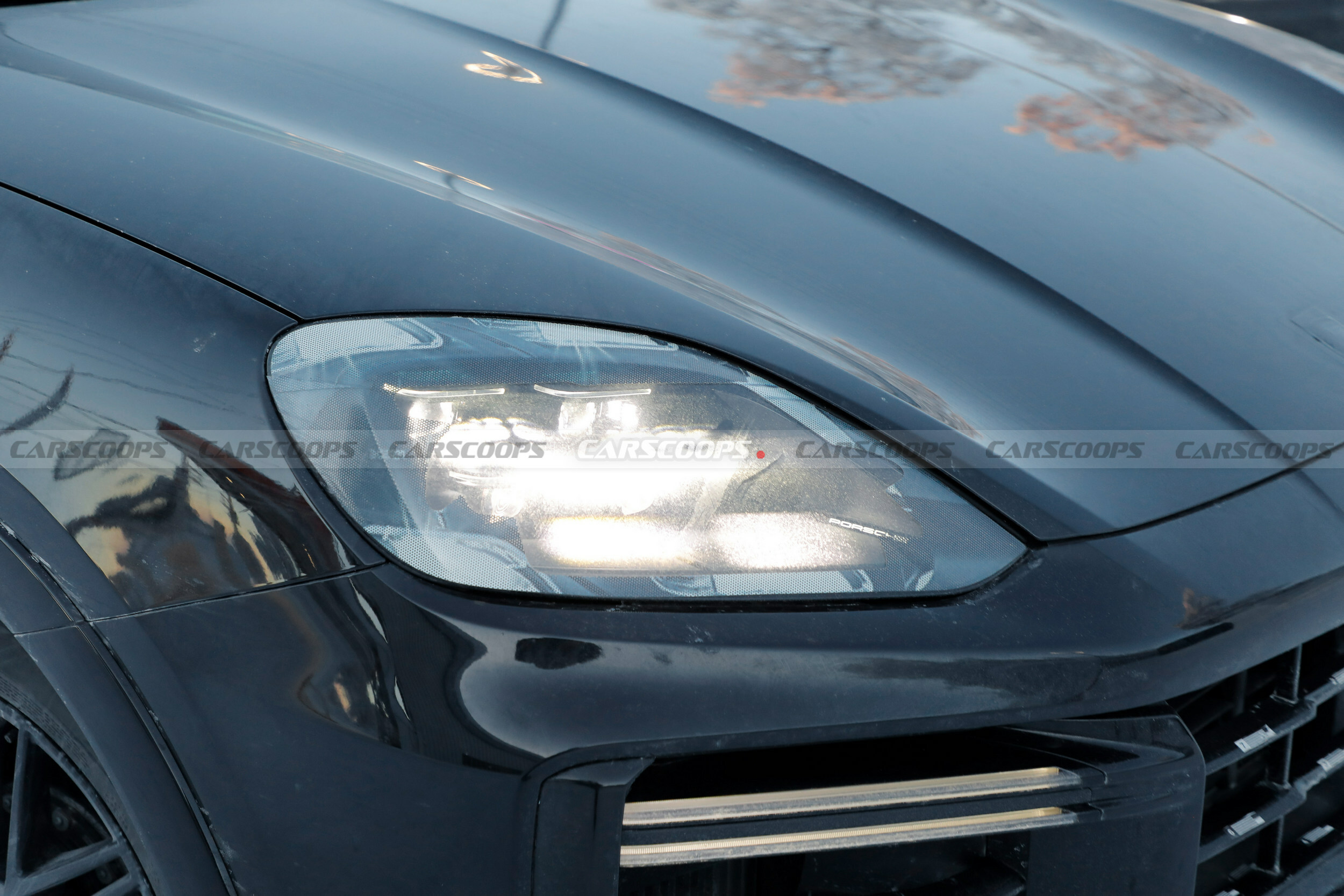 The model appears to be the Cayenne S as it features a familiar front end with a handful of subtle changes. The most notable are angular fins in the outside air intakes, which mimic those found on some versions of the facelifted 911.