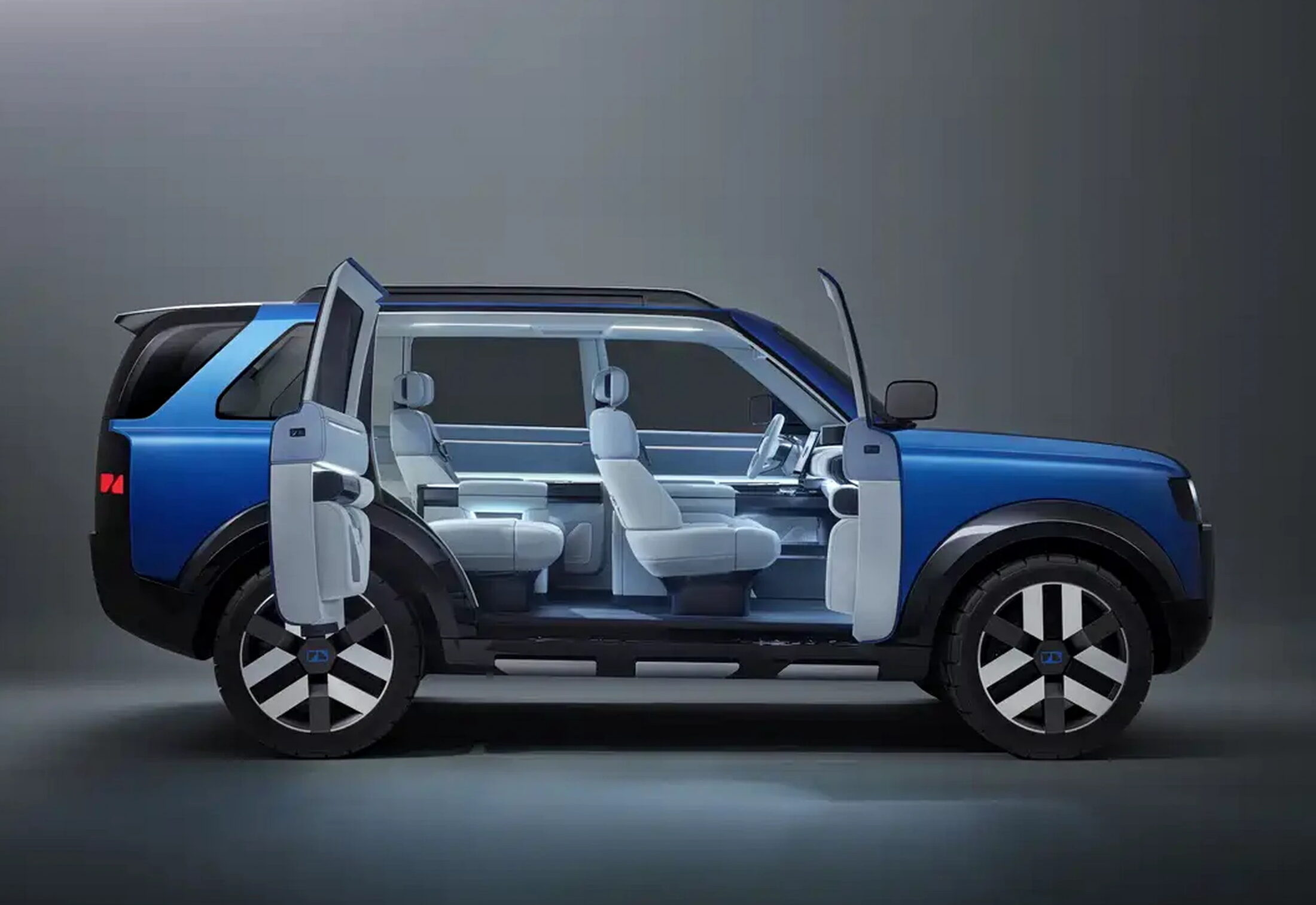 The company showed two cocnept models, finished in Glacier Blue and Thousand Mountain Green. Both feature black cladding paired with aluminum accents across the hood, grille, skid plate, and tailgate. The wheels and tires lean toward concept-car theatrics, and the suicide doors underline that this is still very much a showpiece. Expect those to give way to something more conventional in production, unless Land Rover decides to keep things interesting, at least with the doors.