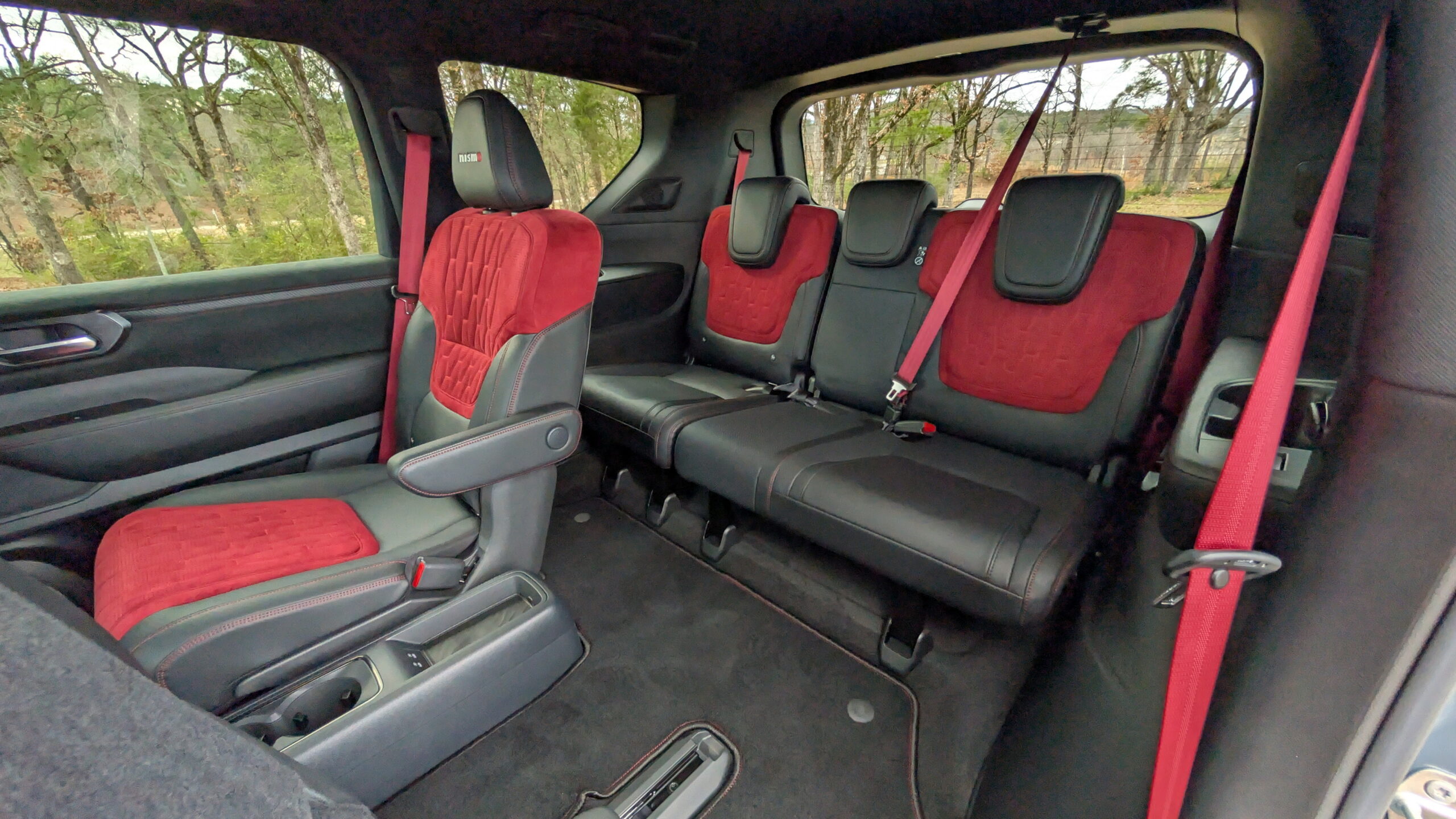 The second row gets its own physical climate controls and similarly posh captain’s chairs. There’s no massage or lateral bolstering, but the red and grey upholstery remains and helps elevate the experience. That said, taller occupants will wish they had more headroom. For as large as this SUV is, it’s not very spacious inside for second and third row riders.