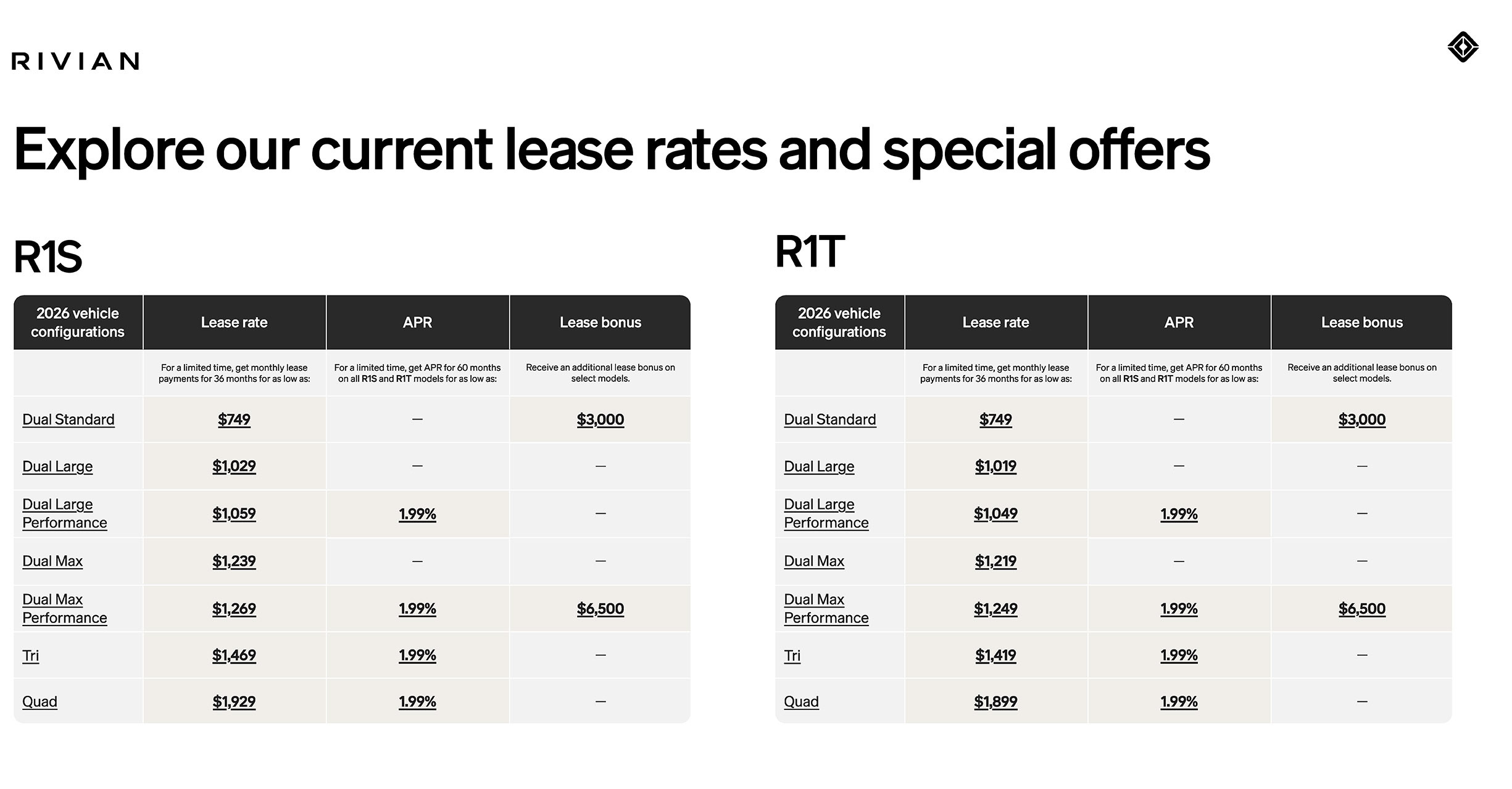 - Rivian is offering $749 per month leases on 2026 R1 models.