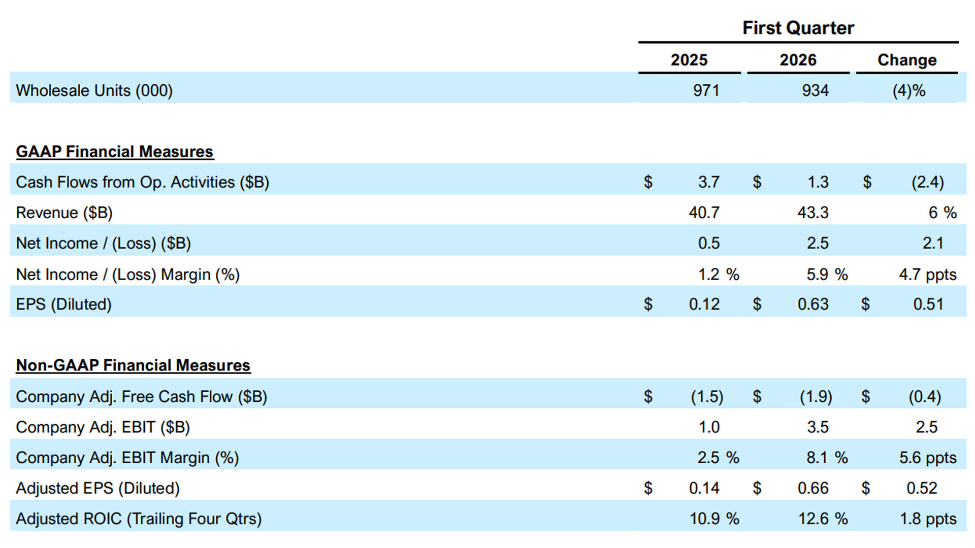 Ford’s U.S. sales dropped 8.8% in the first quarter to 457,315 units, but that didn’t stop them from having a solid Q1. Jumping right into the numbers, first quarter revenue was up 6% to $43.3 billion. More importantly, the company had a net income of $2.5 billion and an adjusted EBIT of $3.5 billion.
