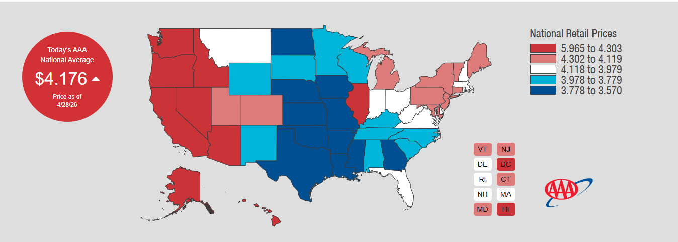 - National average is $4.176 per gallon and $5.461 for diesel.