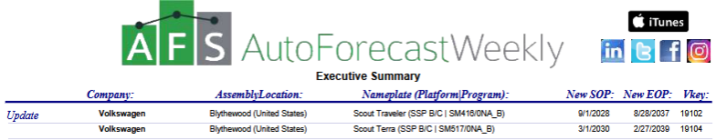 Its reports are used throughout the industry and are often based on supplier plans, internal manufacturing data, and contacts across automakers. In its latest weekly report, AFS lists the Scout Traveler’s start of production at Volkswagen’s new Blythewood, South Carolina plant as September 1, 2028. The Terra pickup is shown starting production on March 1, 2030.